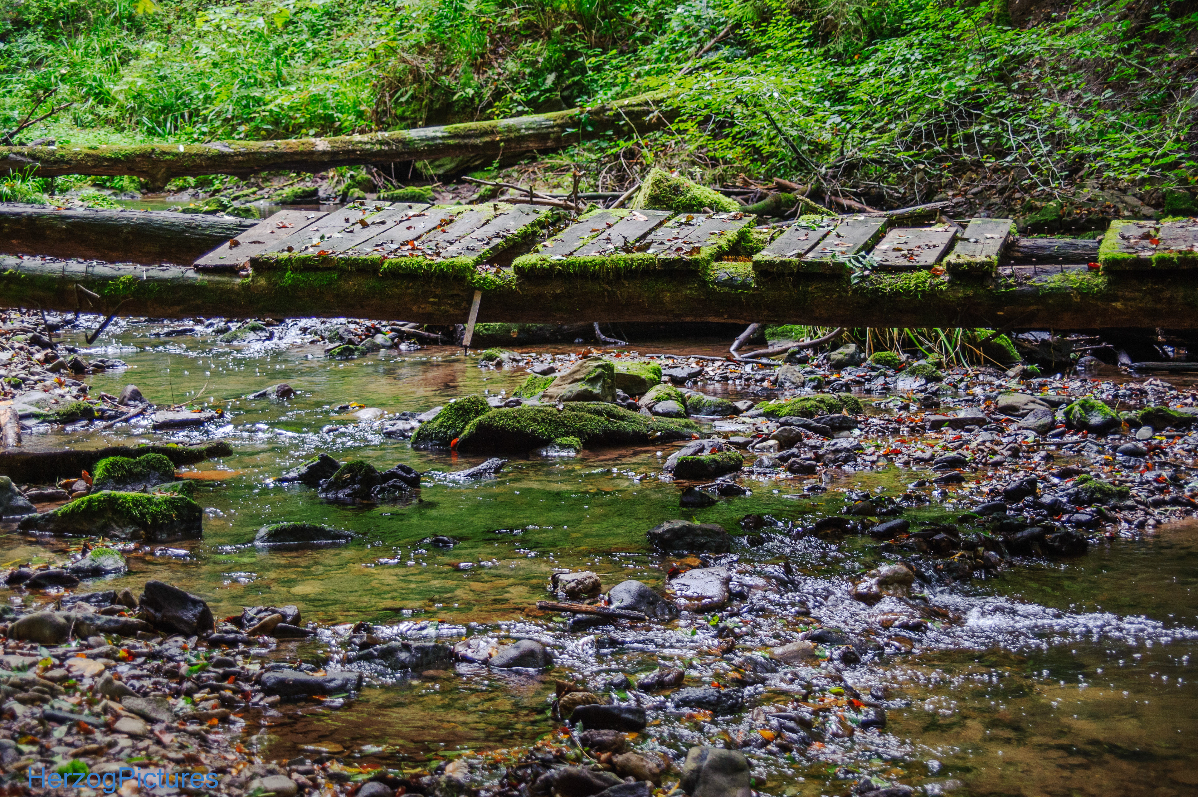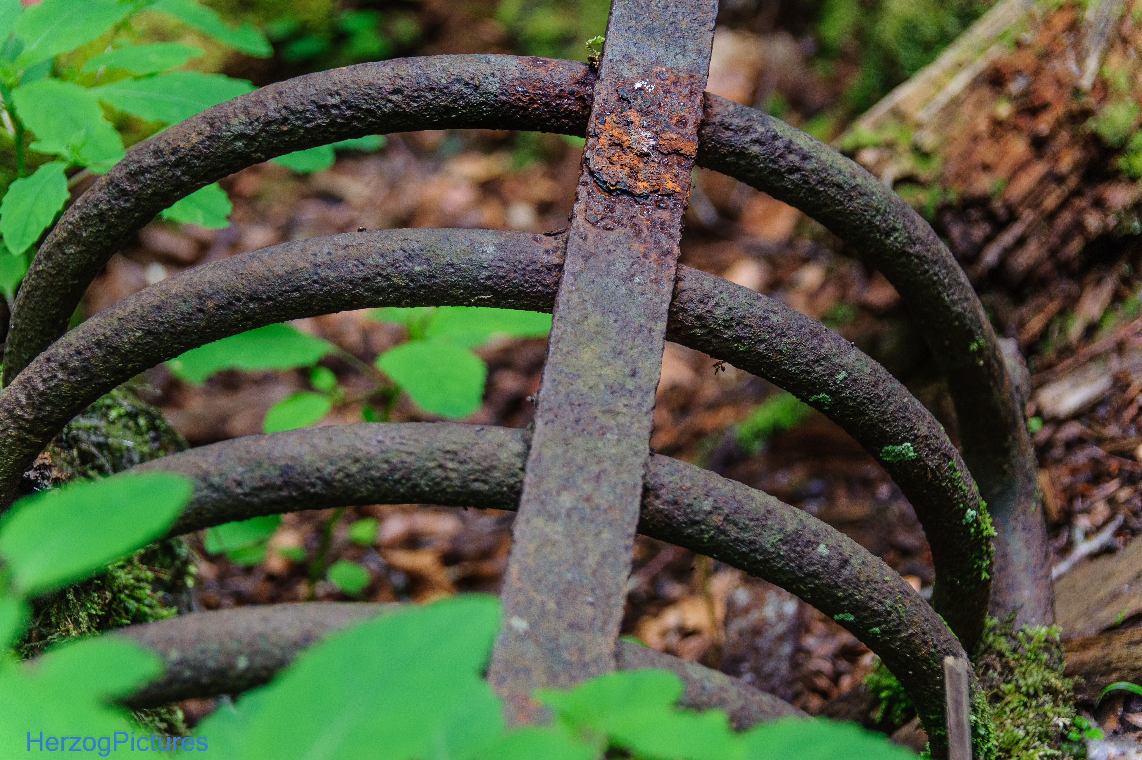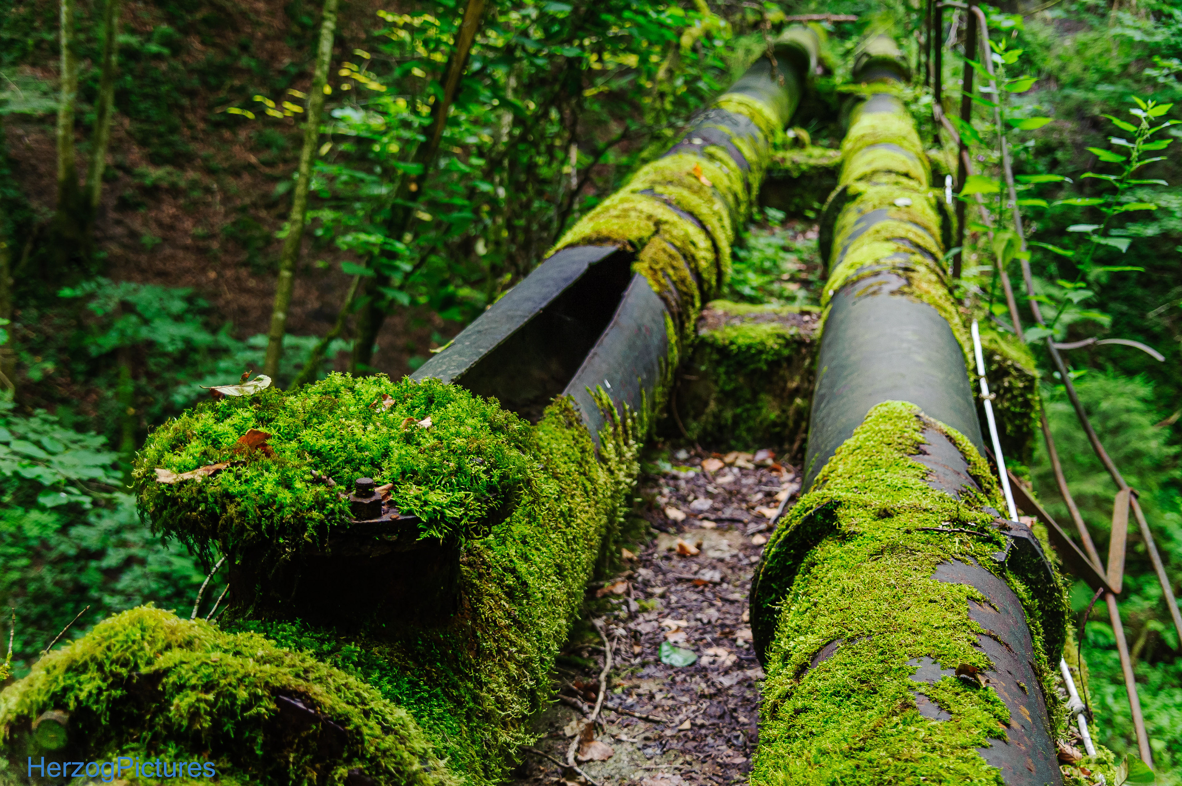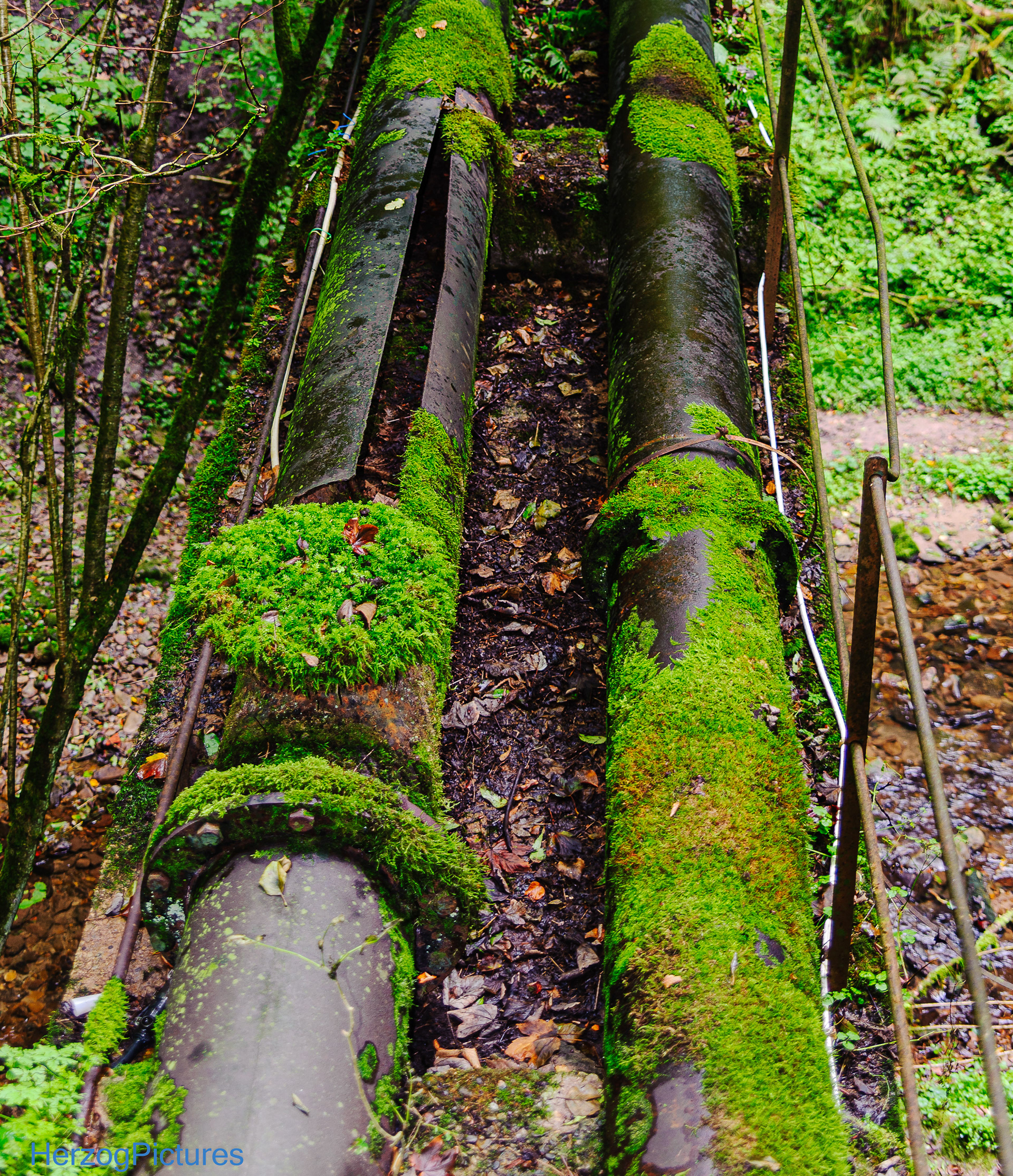 Die zwei Druckrohrleitungen sind ein markantes Feature: Sie überqueren eine Brücke über die Wieslauf in der Nähe eines kleinen Wasserfalls. Die Leitungen sind stark beschädigt – beschrieben als "zerklüftete Druckrohrleitungen", was auf Risse, Brüche oder Platzen hinweist. Es gibt keine expliziten Berichte über einen spezifischen Unfall oder eine "geborstene" Leitung, aber der Verfall deutet auf langfristige Schäden durch Witterung und Alter hin. Sie sind sichtbar und Teil des Weges zur Ruine, verrostet und brüchig.