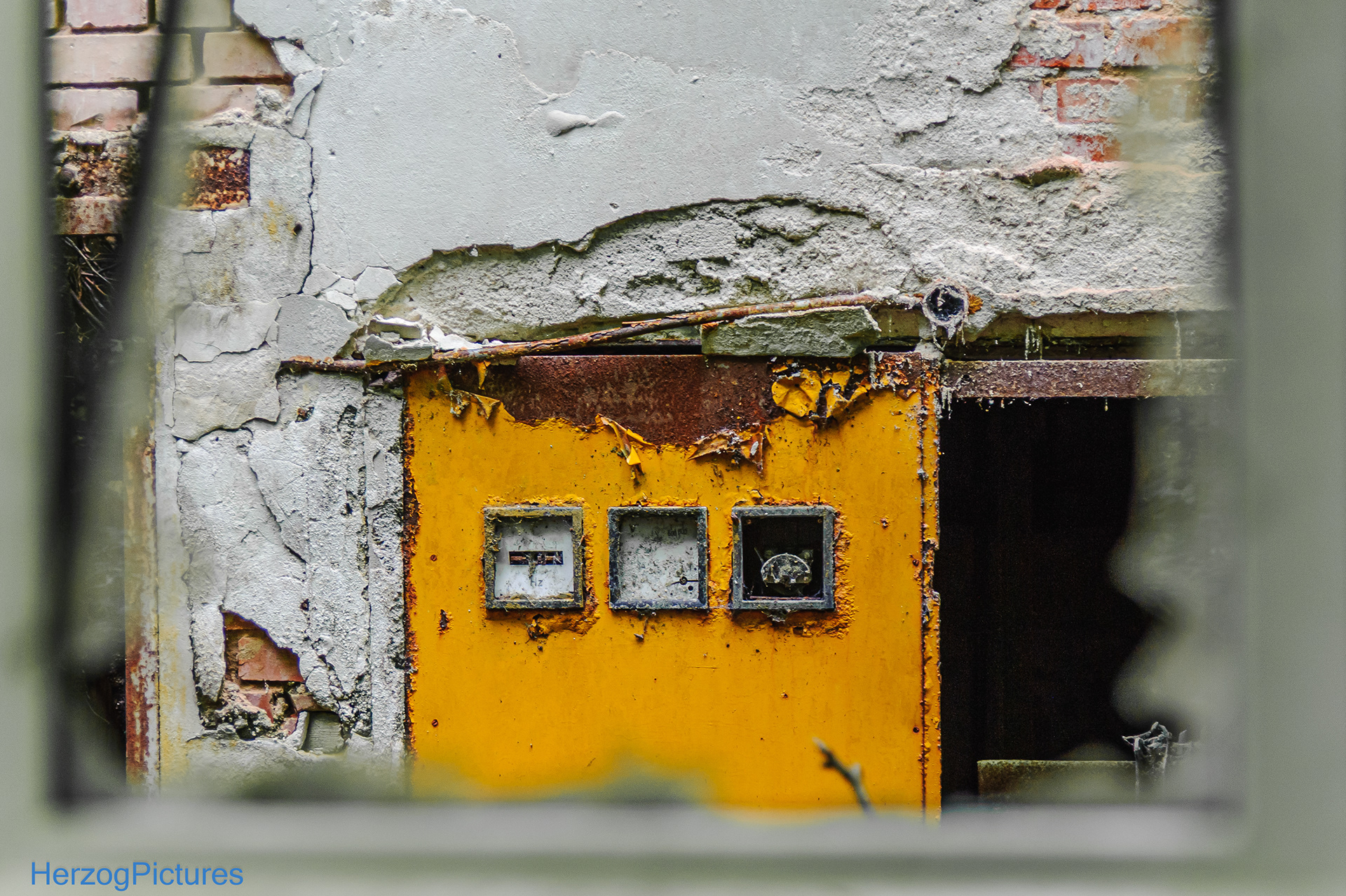Es handelt sich um ein verfallenes Ziegelgebäude mit fehlenden Wandsteinen, zerbrochenen Fenstern (nur Glassplitter übrig), rostigen Metallteilen wie schweren Türen, Schaltanlagen und großen Riegeln. Der Innenraum ist von Moos, Pflanzen und Vegetation überwachsen, Ziegel bröckeln, und tote Bäume mit Flechten umgeben den Ort. Die Atmosphäre ist mystisch und fotogen.