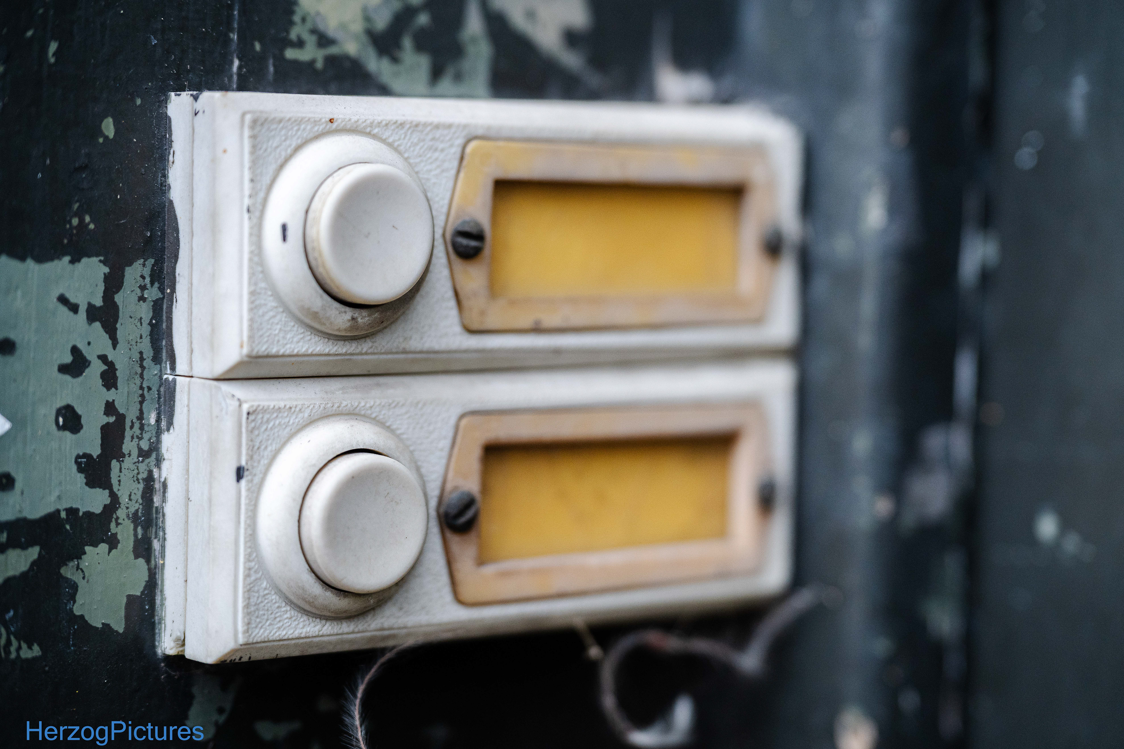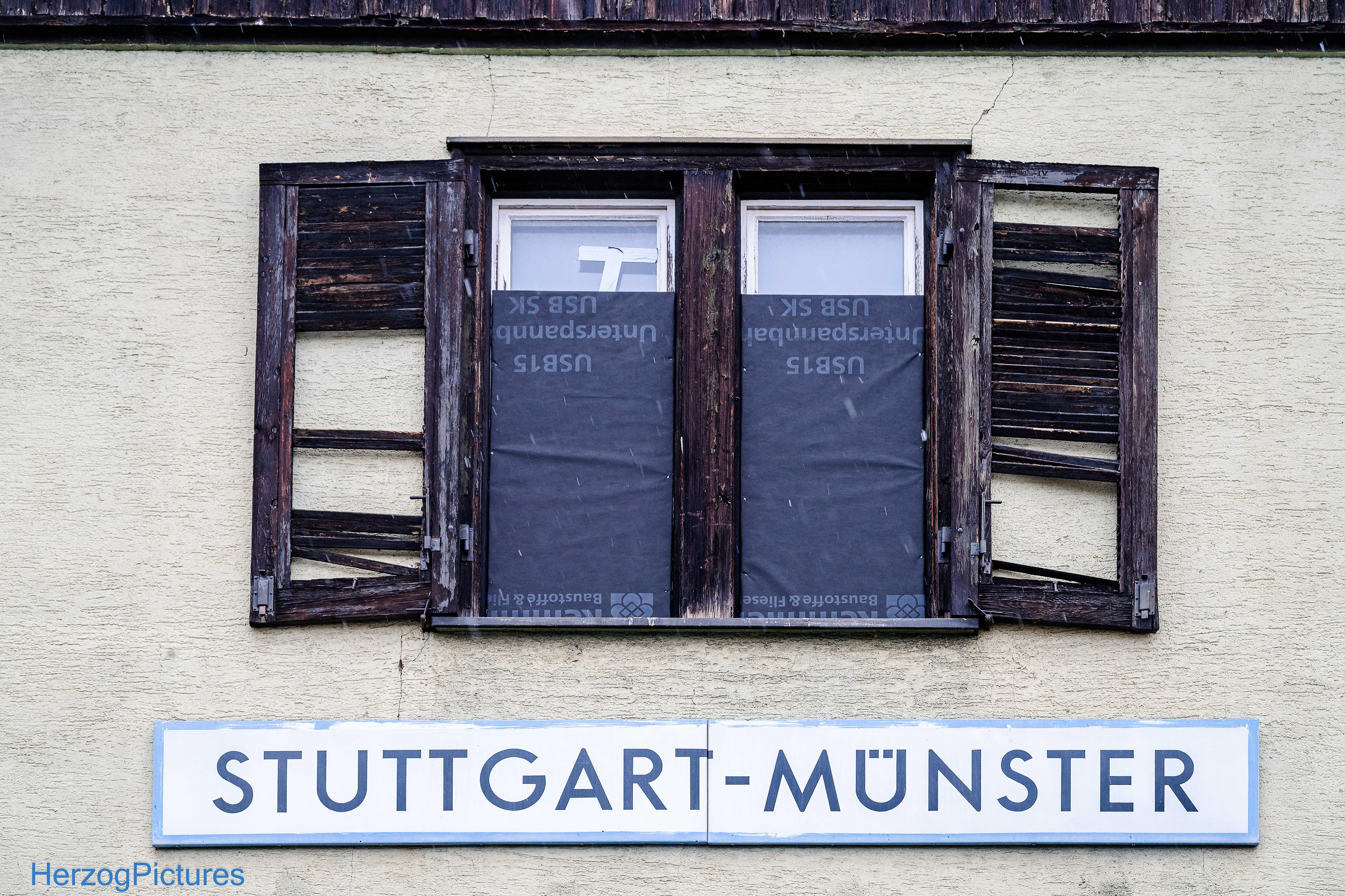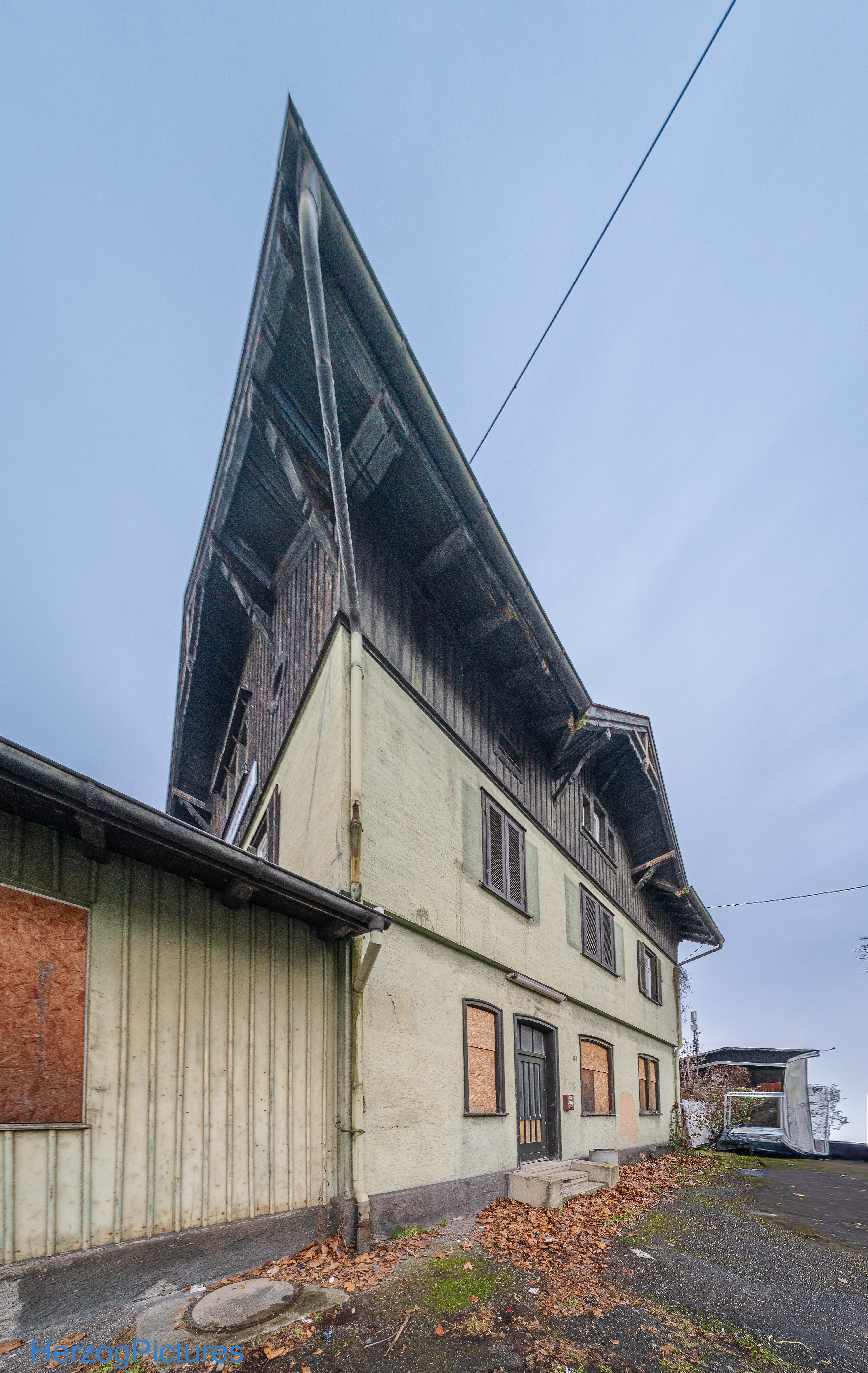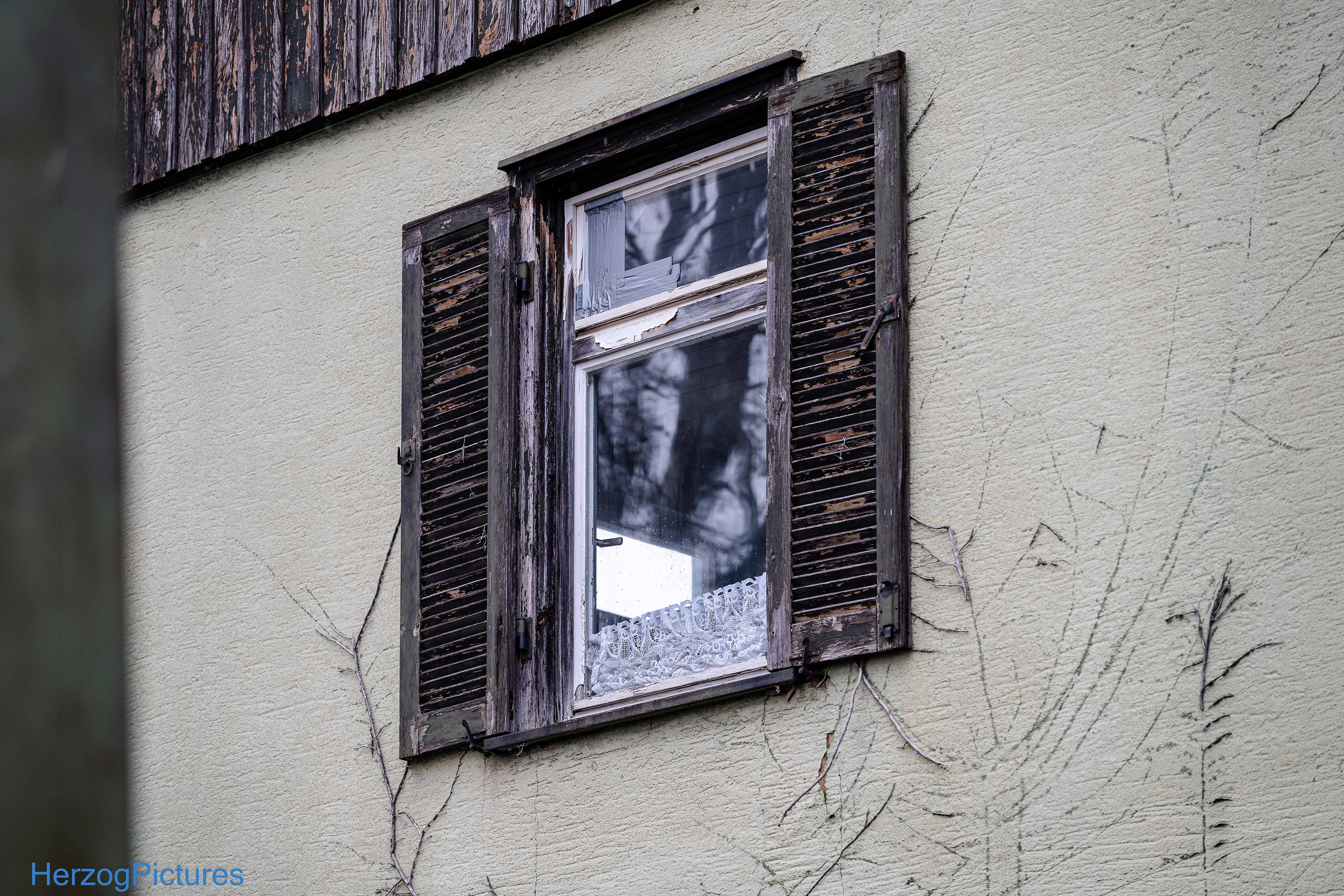 Denkmalgeschütztes Gebäude, aber stark verfallen – Fassade bröckelt, Fenster/Türen zugenagelt, Efeu und Pflanzen wuchern.